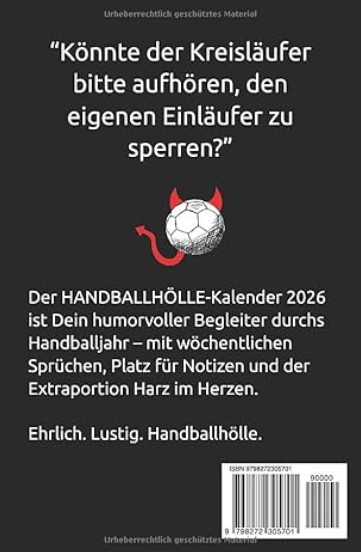 Ob Kreisliga-Held, Trainerin, Zeitnehme-r, Schiri, Fan oder Hallensprecher – dieser Kalender begleitet Dich durchs Handball-Jahr 2026 mit einem Augenzwinkern. Harzabweisend in Tiefschwarz gestaltet – so schwarz, wie der gewohnte Handballhölle-Humor.